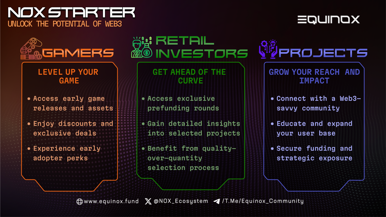 At Equinox, our goal is to empower our community with an innovative platform and a suite of Web3 tools designed to simplify access to the most promising emerging projects. Noxstarter transcends the traditional launchpad concept, providing a blueprint for the next step in the evolution of platforms offering access to early project onboarding. It serves as a gateway, connecting the Equinox Community with high-quality projects in the early stages of building engagement and growth.