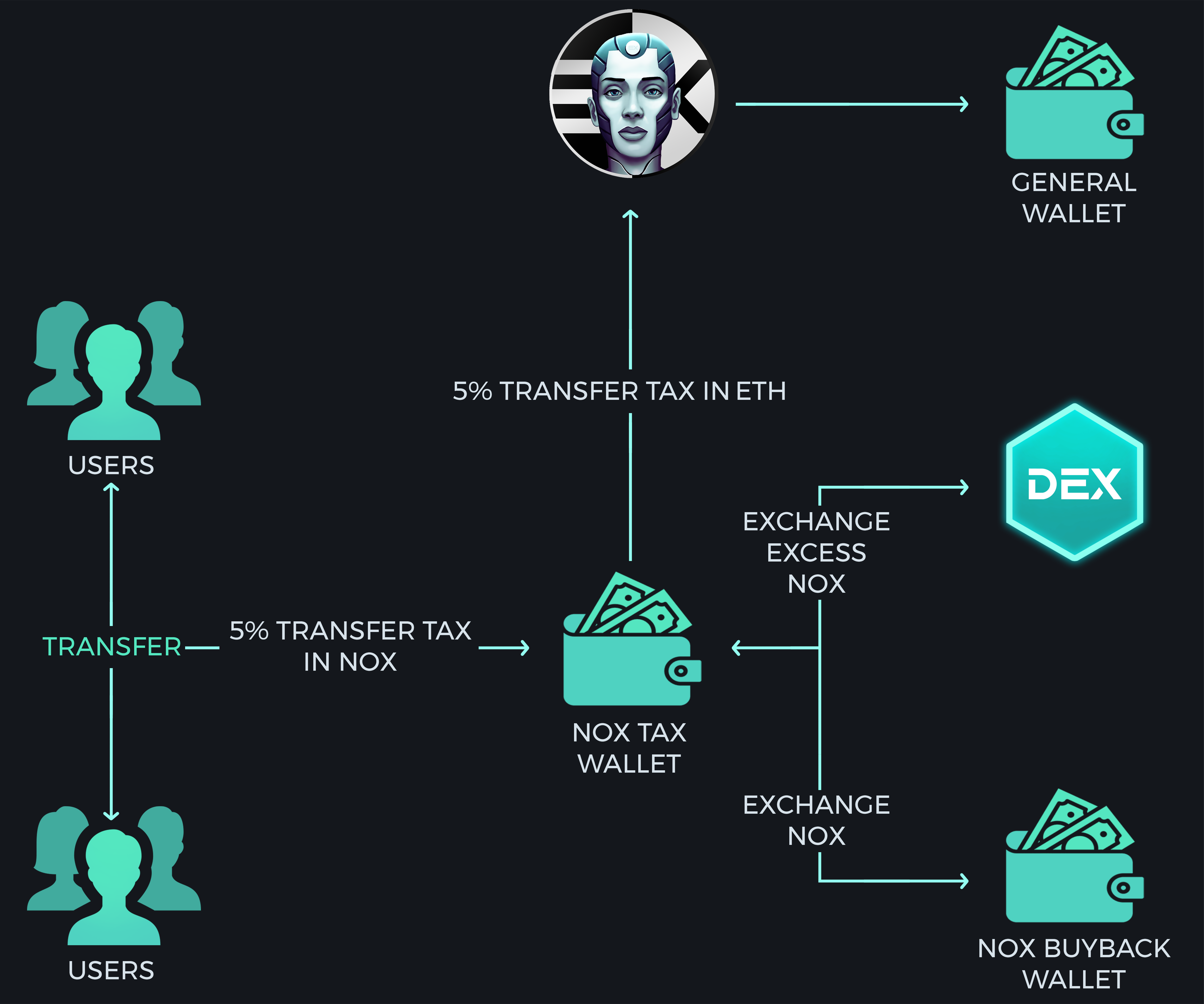 Whenever NOX is transferred between non-exempt wallets, a 5% transfer tax is applied. Equinox automatically receives this 5% in NOX tokens.